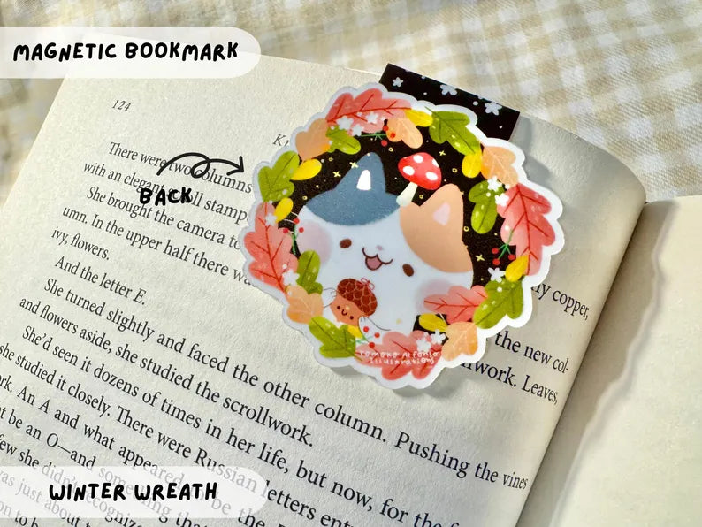 A handy magnetic bookmark featuring a cat and winter wreath by Portland artist Tomoko Alfonso.