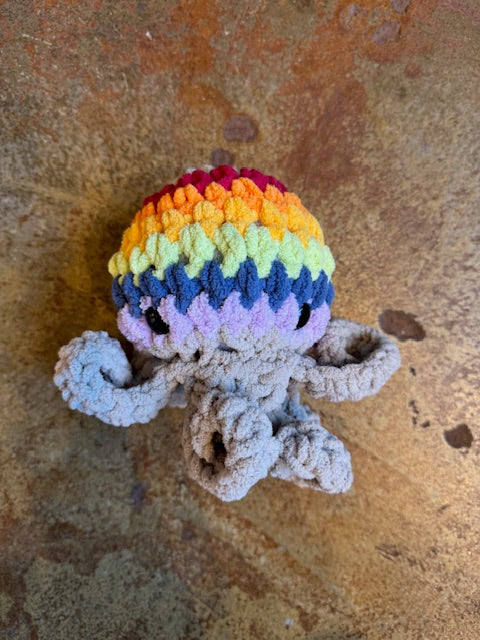 A crocheted chunky rainbow octopus made with blanket yarn. Colors and rainbow variations vary slightly so yours may look a little different than the photos,